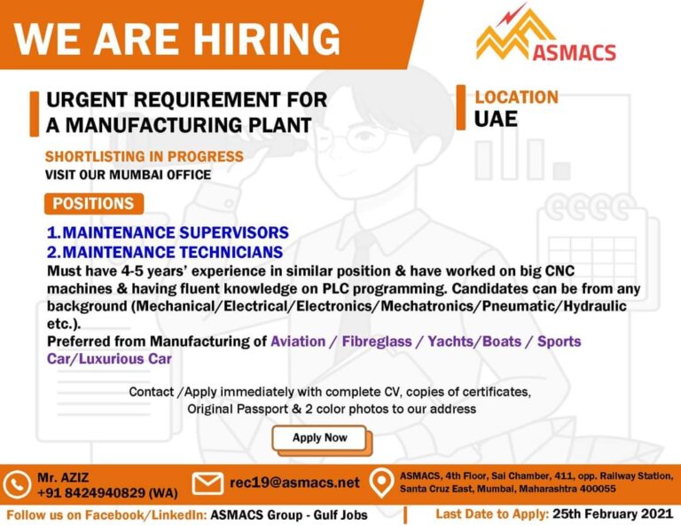 URGENT REQUIREMENT FORA MANUFACTURING PLANTSHORTLISTING IN PROGRESSVISIT OUR MUMBAI OFFICEPOSITIONS MAINTENANCE SUPERVISORS MAINTENANCE TECHNICIANSASMACS LOCATION UAEMust have 4-5 years’ experience …