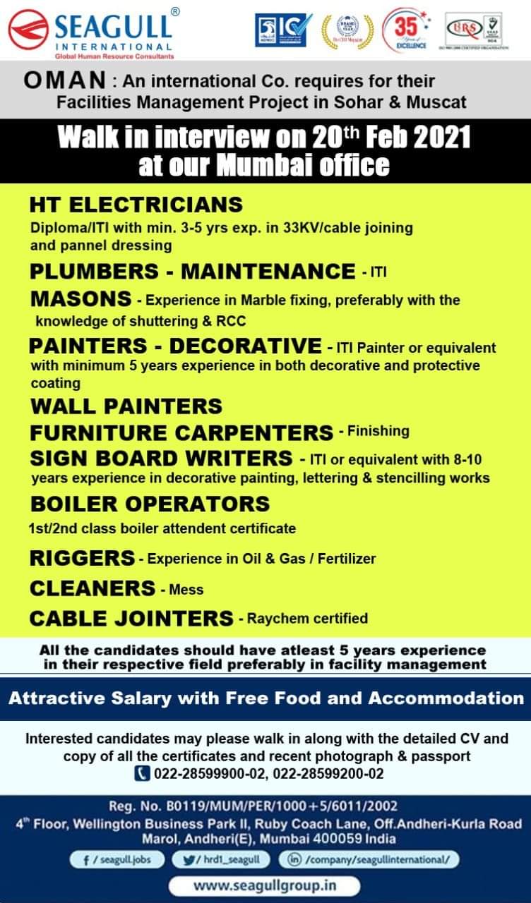 An international Co. requires for theirFacilities Management Project in Sohar & MuscatWalk in interview on 20th Feb 2021at our Mumbai …