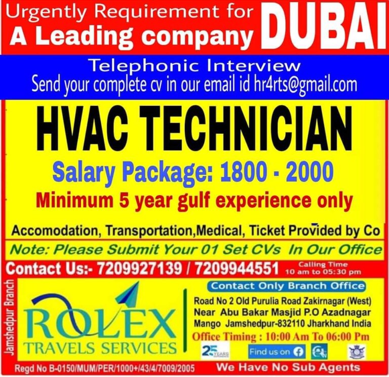 DUBAI Urgently Requirement forA Leading companyTelephonic InterviewSend your complete cv in our email id hr4rts@gmail.comHVAC TECHNICIANsalary Package: 1800 2000Minimum 5 …