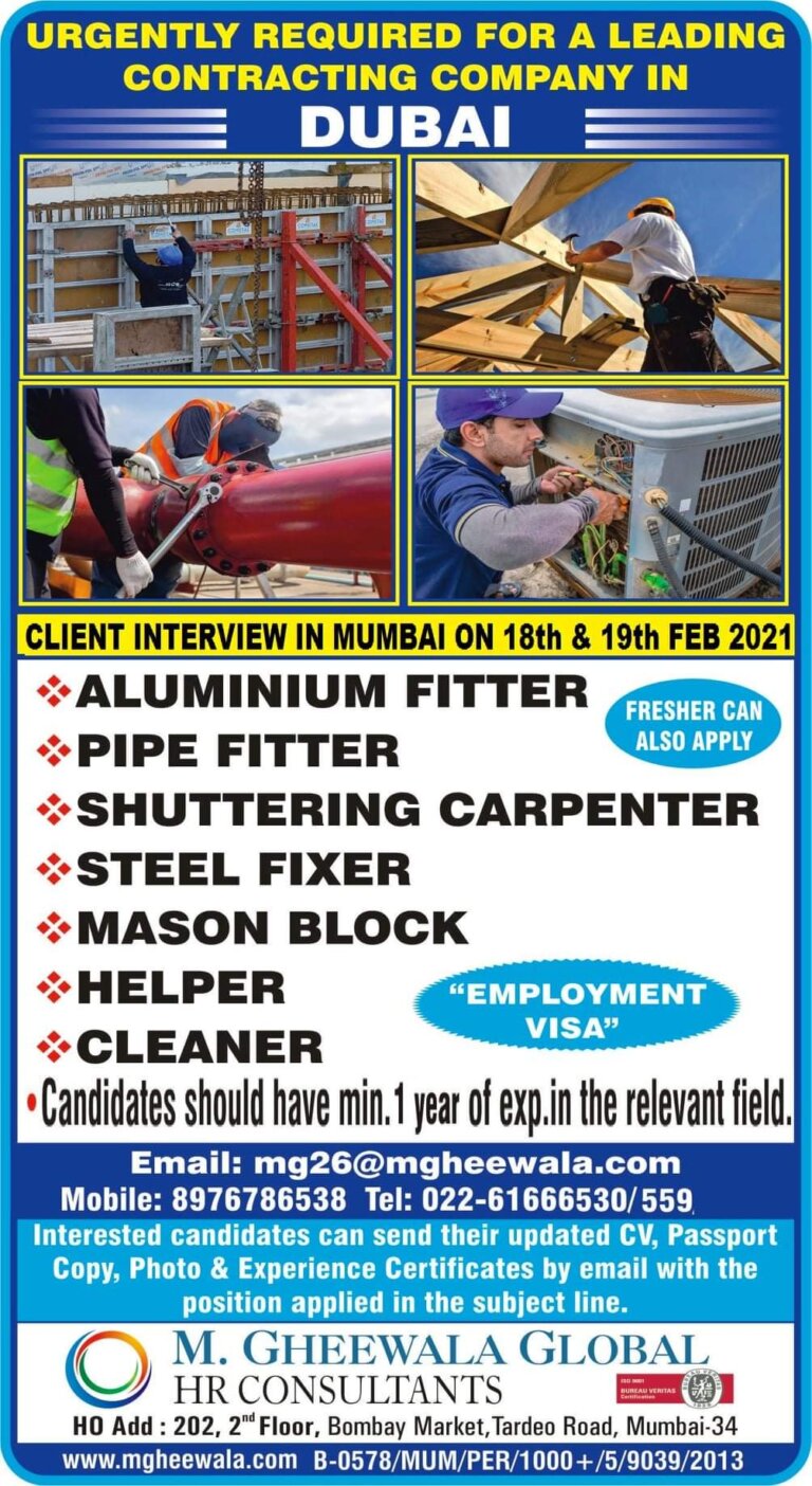 URGENTLY REQUIRED FOR A LEADING CONTRACTING COMPANY INDUBAICLIENT INTERVIEW IN MUMBAI ON 18th & 19th FEB 2021ALUMINIUM FITTERPIPE FITTERFRESHER CANALSO …