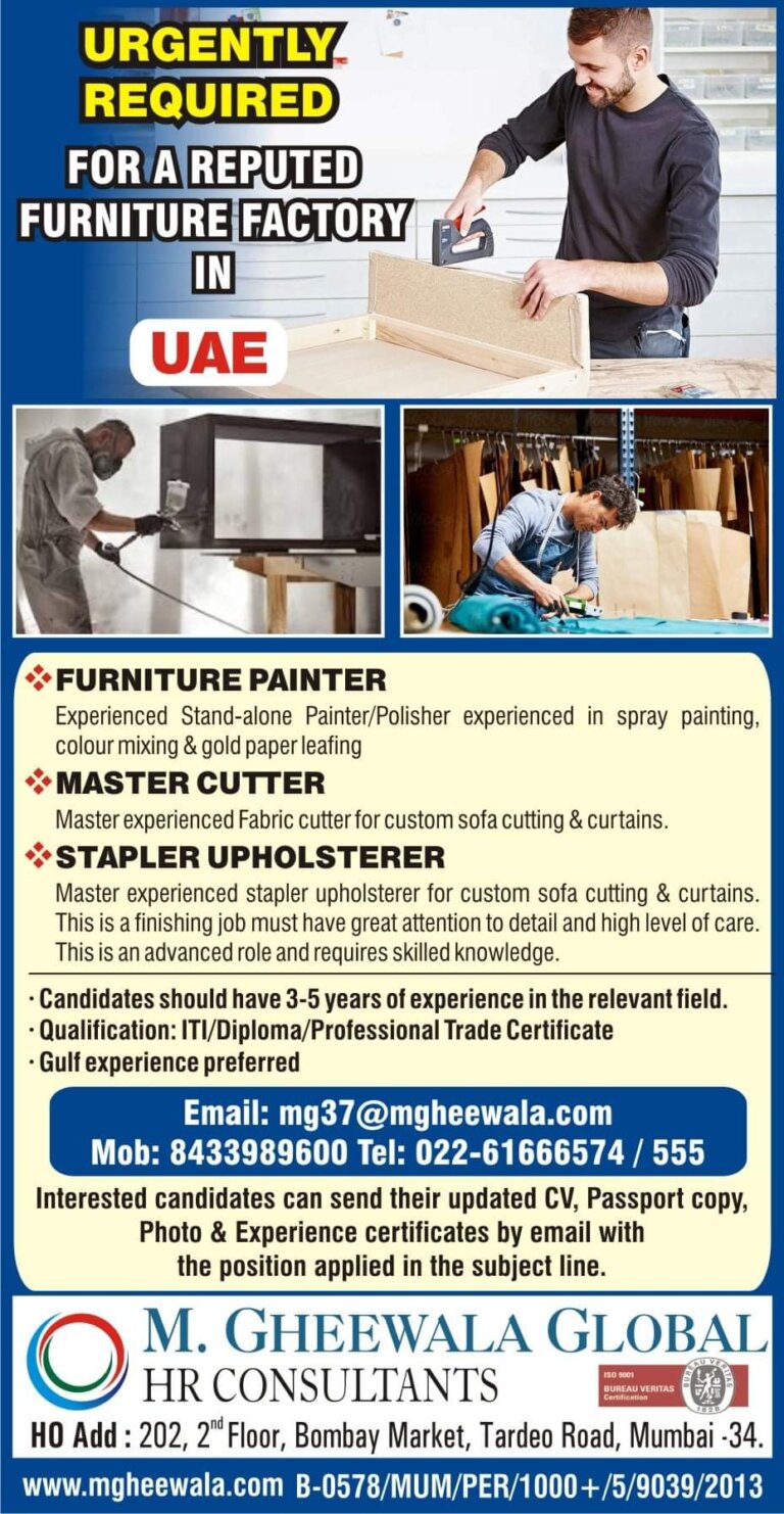 URGENTLY REQUIRED FOR A REPUTED FURNITURE FACTORYUAE# FURNITURE PAINTERExperienced Stand-alone Painter/Polisher experienced in spray painting,colour mixing & gold paper leafing••MASTER …