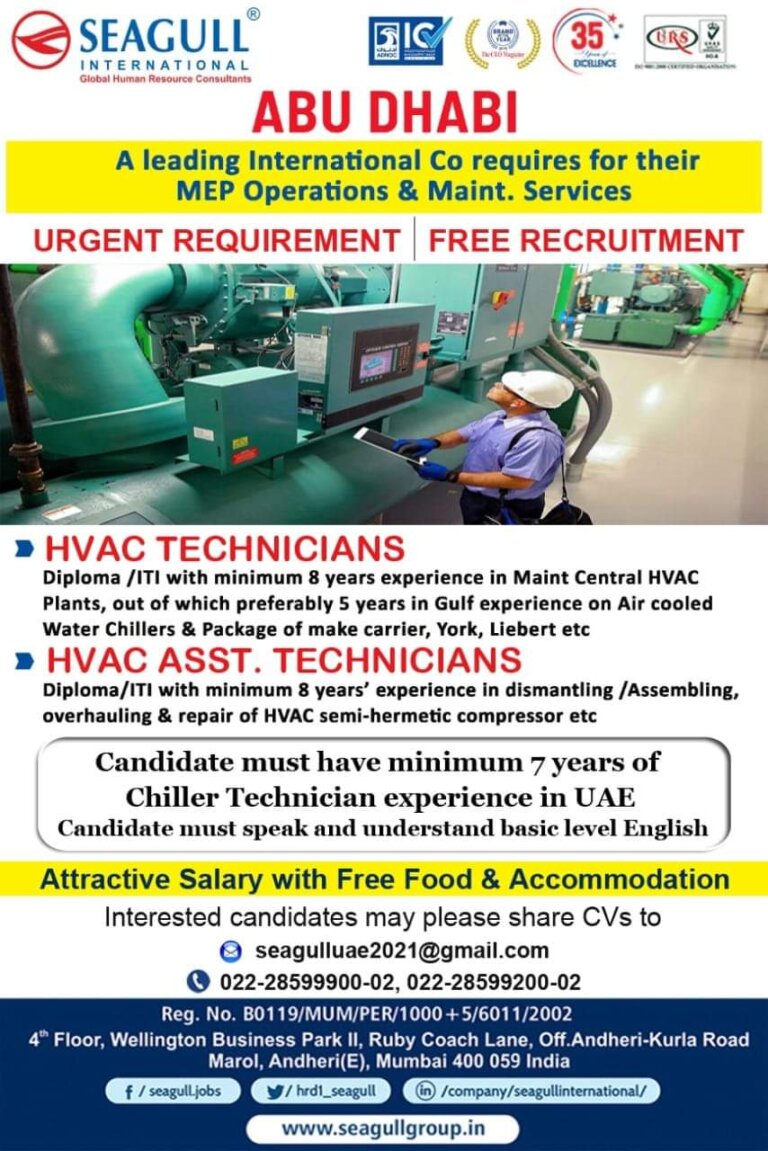 ABU DHABIA leading International Co requires for theirMEP Operations & Maint. ServicesURGENT REQUIREMENT I FREE RECRUITMENT• HVAC TECHNICIANSDiploma “ITI with …
