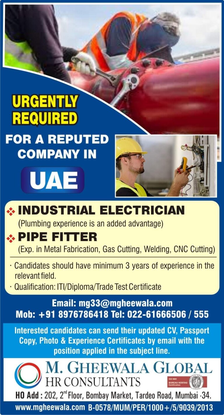 URGENTLY REQUIRED FOR A REPUTED COMPANY IN UAEINDUSTRIAL ELECTRICIAN(Plumbing experience is an added advantage)PIPE FITTER(Exp. in Metal Fabrication, Gas Cutting, …