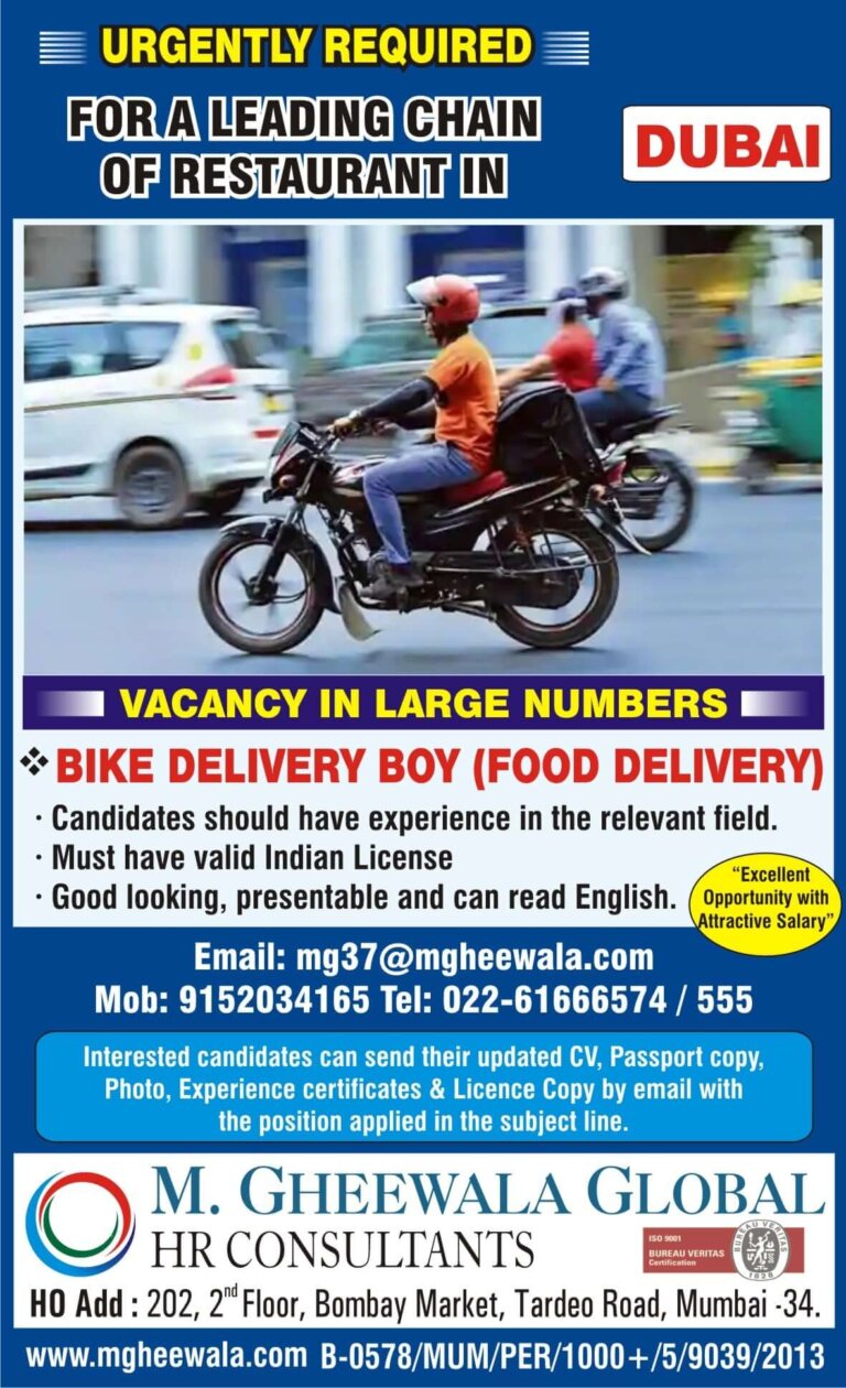 URGENTLY REQUIRED FOR A LEADING CHAIN DUBAIOF RESTAURANT INVACANCY IN LARGE NUMBERS•BIKE DELIVERY BOY (FOOD DELIVERY)• Candidates should have experience …
