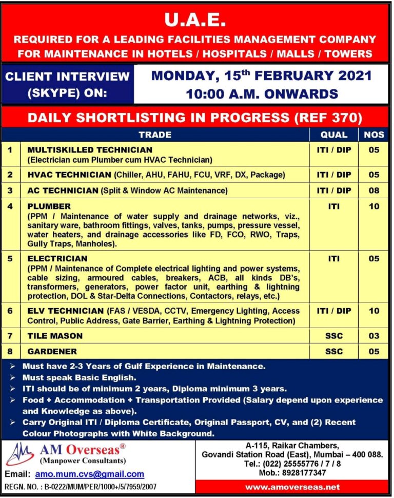 U.A.E. REQUIRED FOR A LEADING FACILITIES MANAGEMENT COMPANYFOR MAINTENANCE IN HOTELS 1 HOSPITALS / MALLS / TOWERSCLIENT INTERVIEW(SKYPE) ON:MONDAY, 15th …
