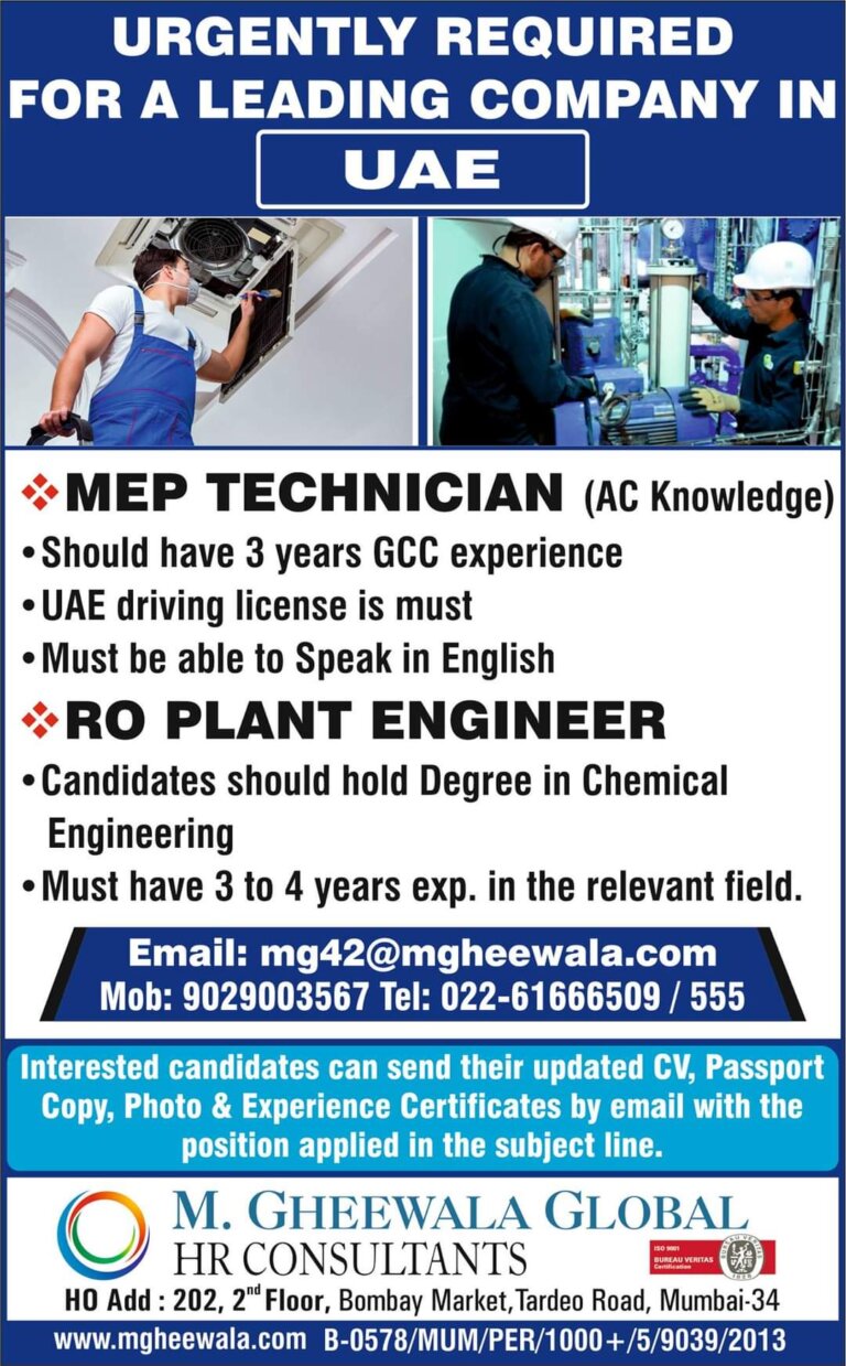 URGENTLY REQUIREDFOR A LEADING COMPANY INMEP TECHNICIAN Knowledge)•Should have 3 years GCC experience• UAE driving license is must•Must be able …