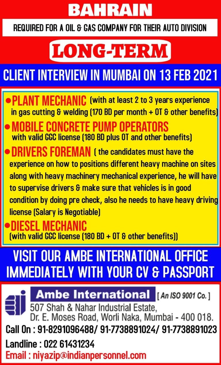 BAHRAINREQUIRED FOR A OIL COMPANY FOR THEIR AUTO DIVISIONLONG-TERMCLIENT INTERVIEW IN MUMBAI ON 13 FEB 2021‘PLANT MECHANIC(with at least 2 …