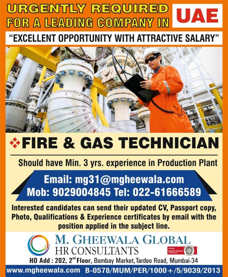 UAE“EXCELLENT OPPORTUNITY WITH ATTRACTIVE SALARY”FIRE & GAS TECHNICIANShould have Min. 3 yrs. experience in Production PlantEmail: mg31@mgheewaIa.comMob: 9029004845 Tel: 022-61666589Interested …