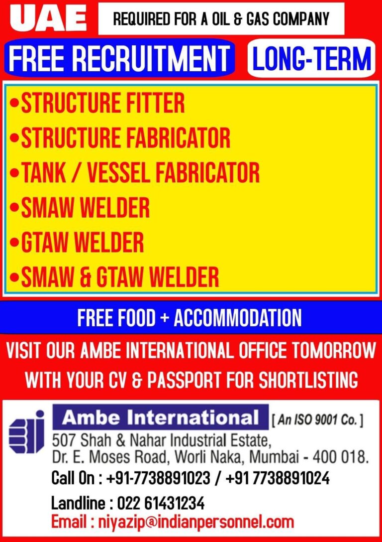 UAE REQUIRED FOR A OIL COMPANYFREE RECRUITMENT’‘STRUCTURE FITTER‘STRUCTURE FABRICATOR/ VESSEL FABRICATOROSMAW WELDERWELDER,spnw GTAW WELDERFREE FOOD + ACCOMMODATIONVISIT OUR AMBE INTERNATIONAL …