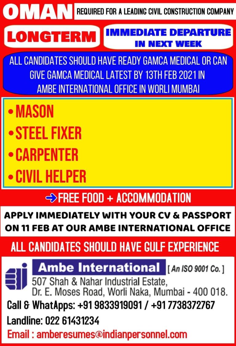 OMANREQUIRED FOR A LEADING CIVIL CONSTRUCTION COMPANYIMMEDIATE DEPARTURELONGTERMIN NEXT WEEKALL CANDIDATES SHOULD HAVE READY GAMCA MEDICAL OR CANGIVE GAMCA MEDICAL …