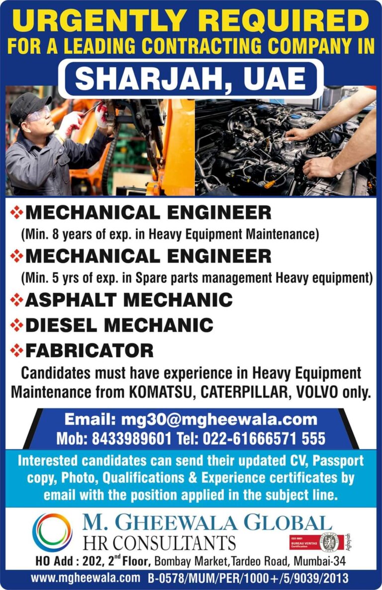 URGENTLY REQUIREDFOR A LEADING CONTRACTING COMPANY INSHARJAH, UAEMECHANICAL ENGINEER(Min. 8 years of exp. in Heavy Equipment Maintenance)MECHANICAL ENGINEER(Min. 5 yrs …