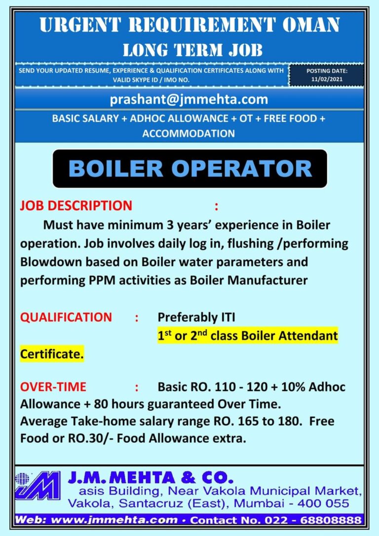 URGENT REQUIREMENT OMANLONG TERM JOBSEND YOUR UPDATED RESUME, EXPERIENCE & QUALIFICATION CERTIFICATES ALONG WITHVALID SKYPE ID / IMO NO.prashant@jmmehta.comPOSTING DATE:11/02/2021BASIC …