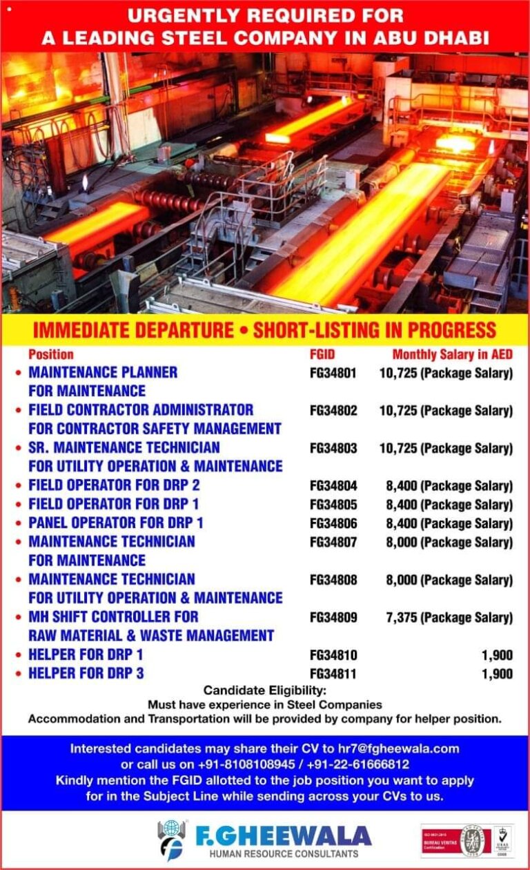 URGENTLY REQUIRED FORA LEADING STEEL COMPANY IN ABU DHABIIMMEDIATE DEPARTURE • SHORT-LISTING IN PROGRESSPositionMAINTENANCE PLANNERFOR MAINTENANCE• FIELD CONTRACTOR ADMINISTRATORFOR CONTRACTOR …