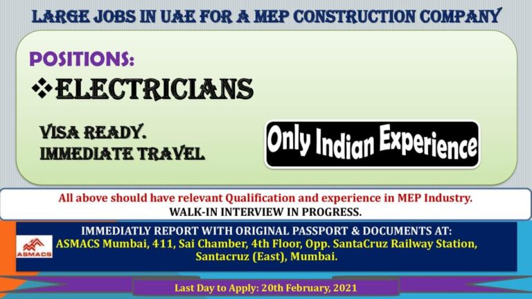 LARGE JOBS IN FORA CONSTRUCTION COMPANYPOSITIONS:*ELECTRICIANSREADY.IMMEDIATE TRAVELAll above should have relevant Qualification and experience in MEP Industry.WALK-IN INTERVIEW IN PROGRESS.IMMEDIATLY …