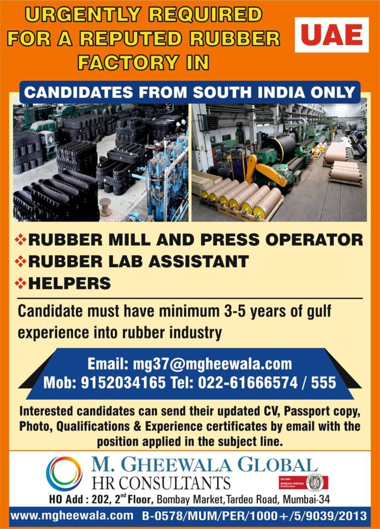 UAE A REPUTED FACTORYCANDIDATES FROM SOUTH INDIA ONLYRUBBER MILL AND PRESS OPERATORRUBBER LAB ASSISTANTHELPERSCandidate must have minimum 3-5 years of …