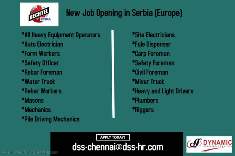 New Job Opening in Serbia (Europe)*All Heavy Equipment Operators*Auto Electrician*Form Workers*Safety Officer*Rebar Foreman*Water Truck*Rebar Workers*Masons*Mechanics*Pile Driving Mechanics*Site Electricians*Fule Dispenser*Carp Foreman*Safety …