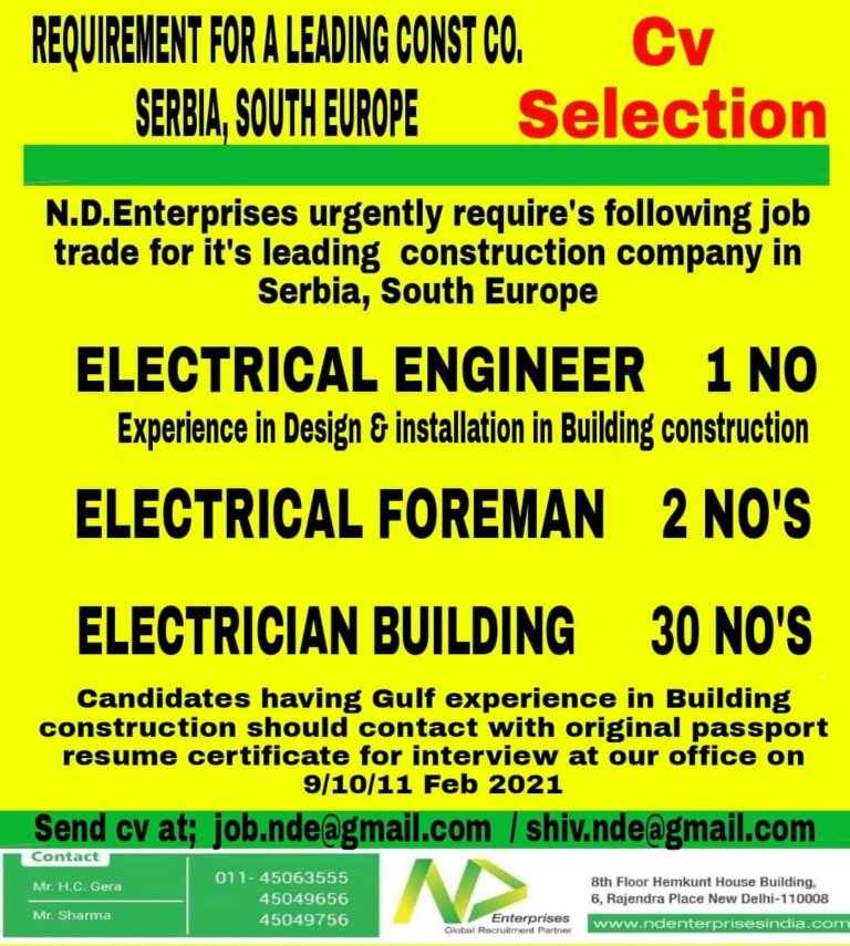REQUIREMENT FOR A LEADING CONSTSelection SERBIAN.D.Enterprises urgently require’s following jobtrade for it’s leading construction company inSerbia, South EuropeELECTRICAL ENGINEER INOExperience …
