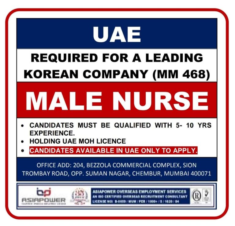 UAE REQUIRED FOR A LEADINGKOREAN COMPANY (MM 468)MALE NURSECANDIDATES MUST BE QUALIFIED WITH 5- 10 YRSEXPERIENCE.HOLDING I-JAE MOH LICENCECANDIDATES AVAILABLE …