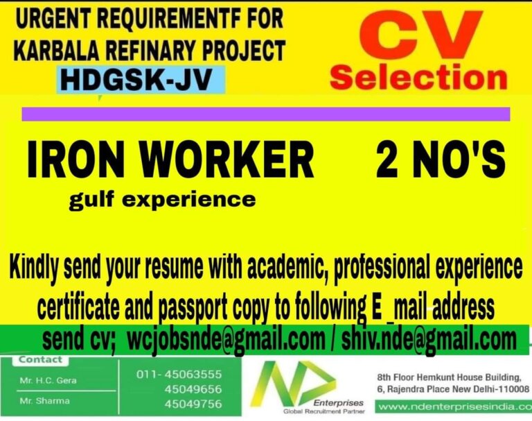 URGENT REQUIREMENT FORKARBALA REFINARY PROJECTHDGSK-JVcvSelectionIRON WORKER 2 NO’Sgulf experienceKindly send your resume with academic, professional experiencecertificate and passport copy to …