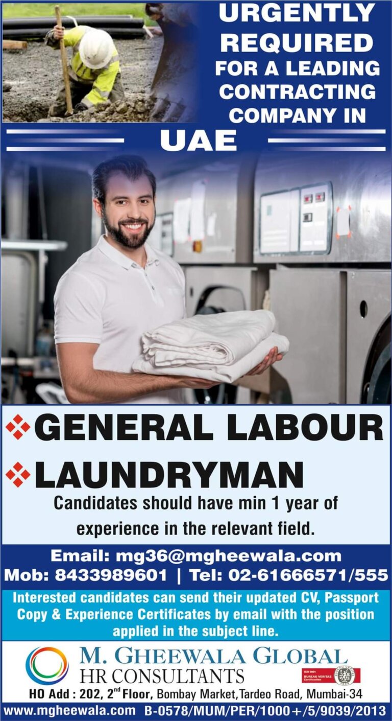 URGENTLY REQUIRED FOR A LEADING CONTRACTINGCOMPANY IN UAEGENERAL LABOURLAUNDRYMANCandidates should have min 1 year ofexperience in the relevant field.Email: mg36@mgheewaIa.comMob: …