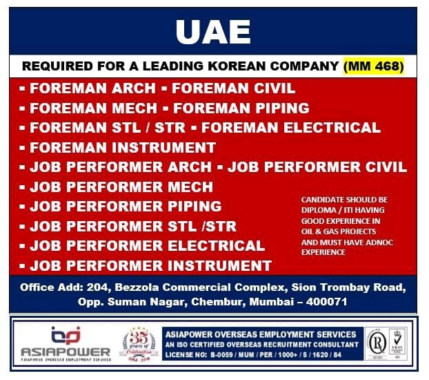 UAE REQUIRED FOR A LEADING KOREAN COMPANY (MM 468)• FOREMAN ARCH • FOREMAN CIVIL• FOREMAN MECH • FOREMAN PIPING• FOREMAN …