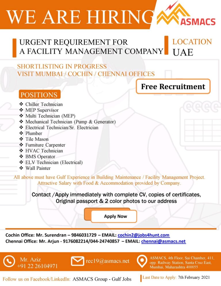 URGENT REQUIREMENT FORA FACILITY MANAGEMENT COMPANYSHORTLISTING IN PROGRESSVISIT MUMBAI / COCHIN / CHENNAI OFFICESLOCATIONUAEFree RecruitmentPOSITIONS• Chiller Technician• MEP SupervisorMulti Technician …