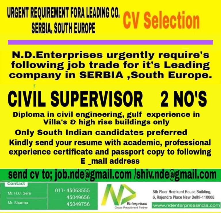 URGENT REQUIREMENT FORA LEADINGCV SelectionSERBIA, SOUTH EUROPEN.D.Enterprises urgently require’sfollowing job trade for it’s Leadingcompany in SERBIA ,South Europe.SUPERVISOR 2NO’SDiploma in …