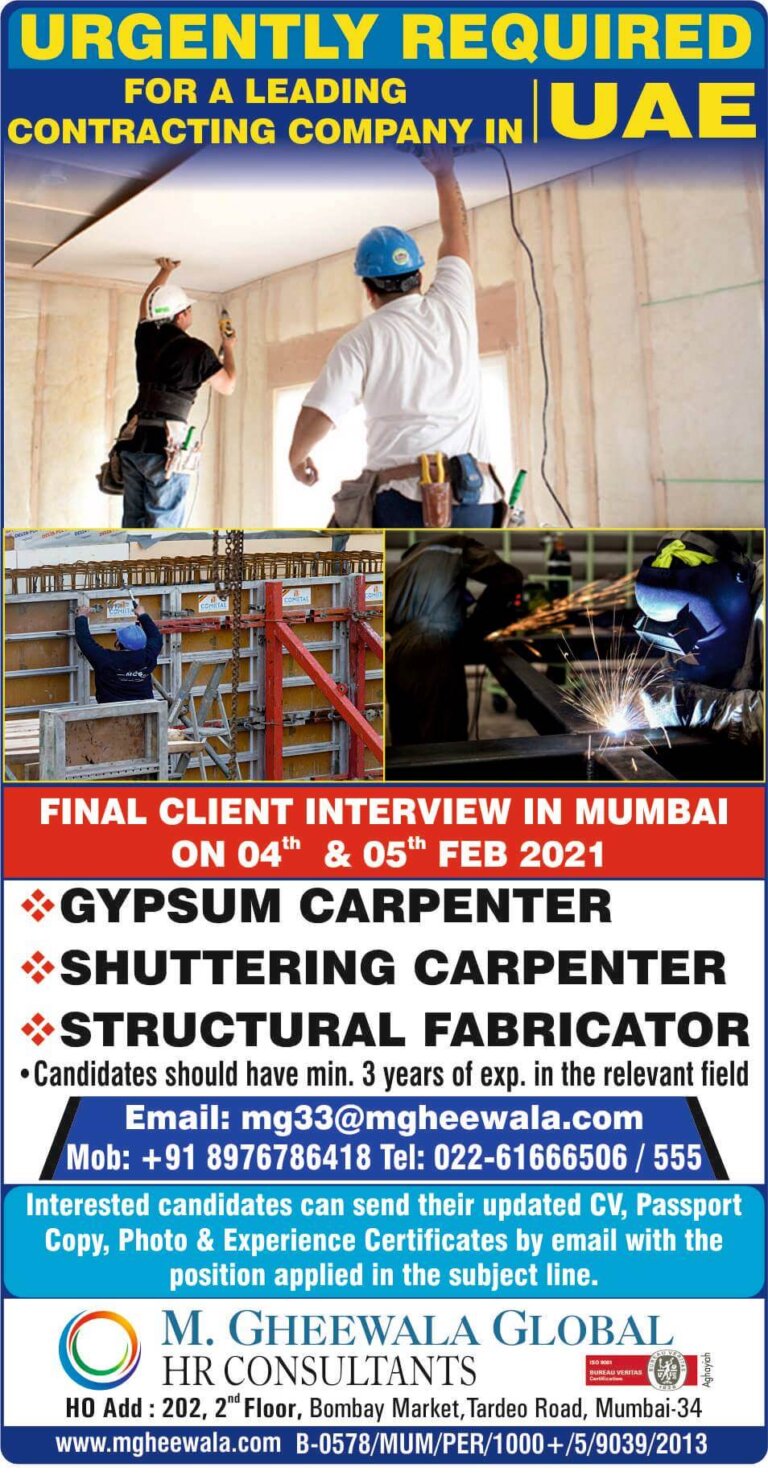 URGENTLY REQUIRED*FOR A LEADING CONTRACTING COMPANY IN UAE FINAL CLIENT INTERVIEW IN MUMBAION 04th & 05th FEB 2021GYPSUM CARPENTERSHUTTERING CARPENTERSTRUCTURAL …