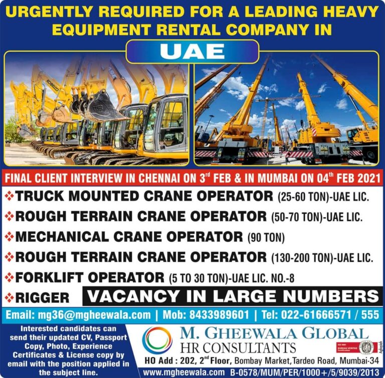 URGENTLY REQUIRED FOR A LEADING HEAVYEQUIPMENT RENTAL COMPANY INUAEFINAL CLIENT INTERVIEW IN CHENNAI ON FEB & IN MUMBAI ON 04th …
