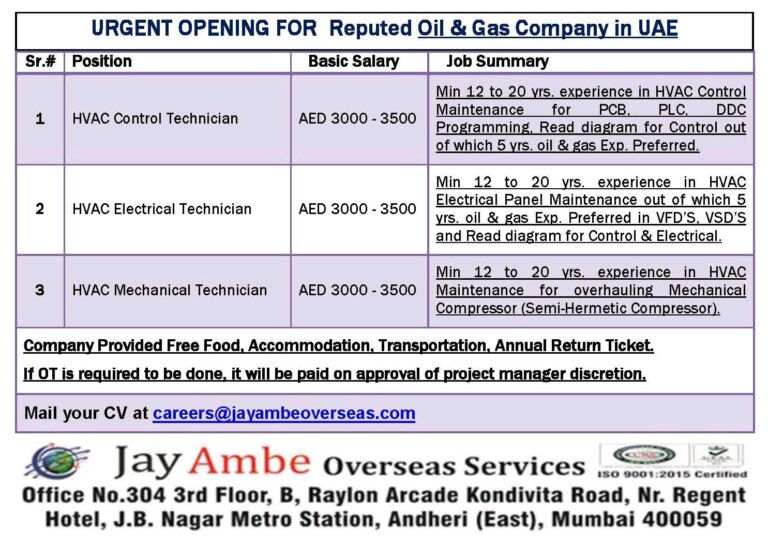 URGENT OPENING FOR Reputed Oil & Gas Company in UAEHVAC Control TechnicianHVAC Electrical TechnicianHVAC Mechanical TechnicianBasic SalaryJob SummaryMin 12 to …