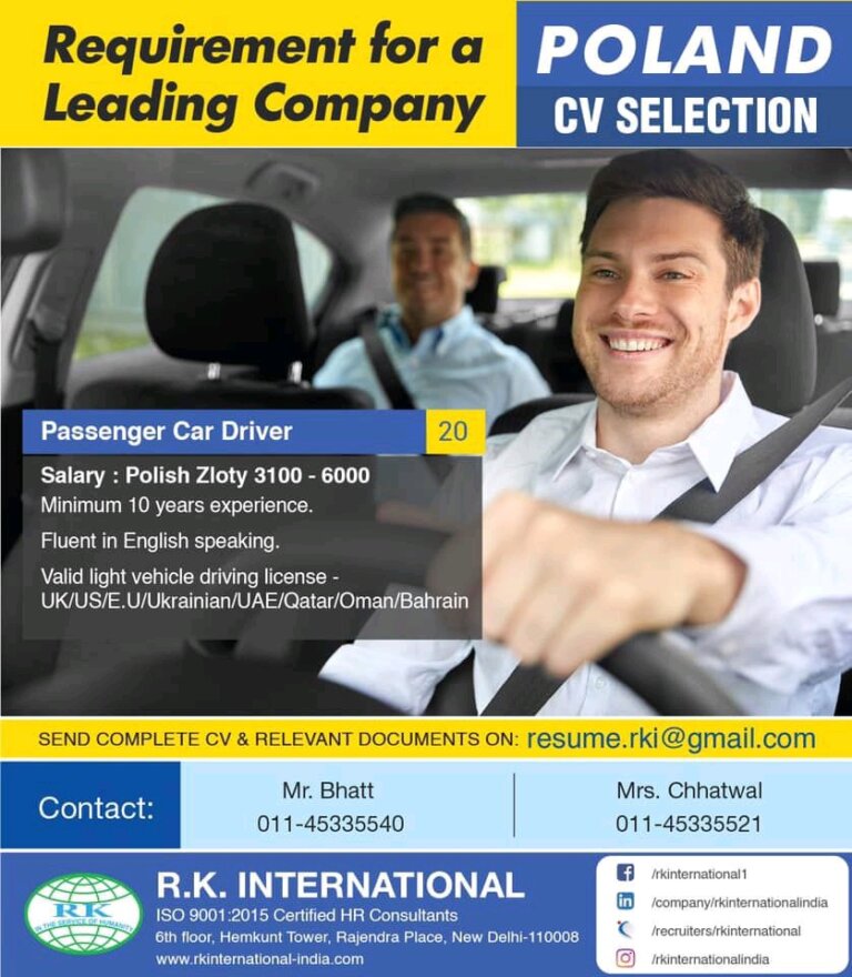 Requirement for a POLANDLeading CompanyCV SELECTIONPassenger Car Driversalary : Polish Zloty 3100 – 6000Minimum 10 years experience.Fluent in English speaking.Valid …