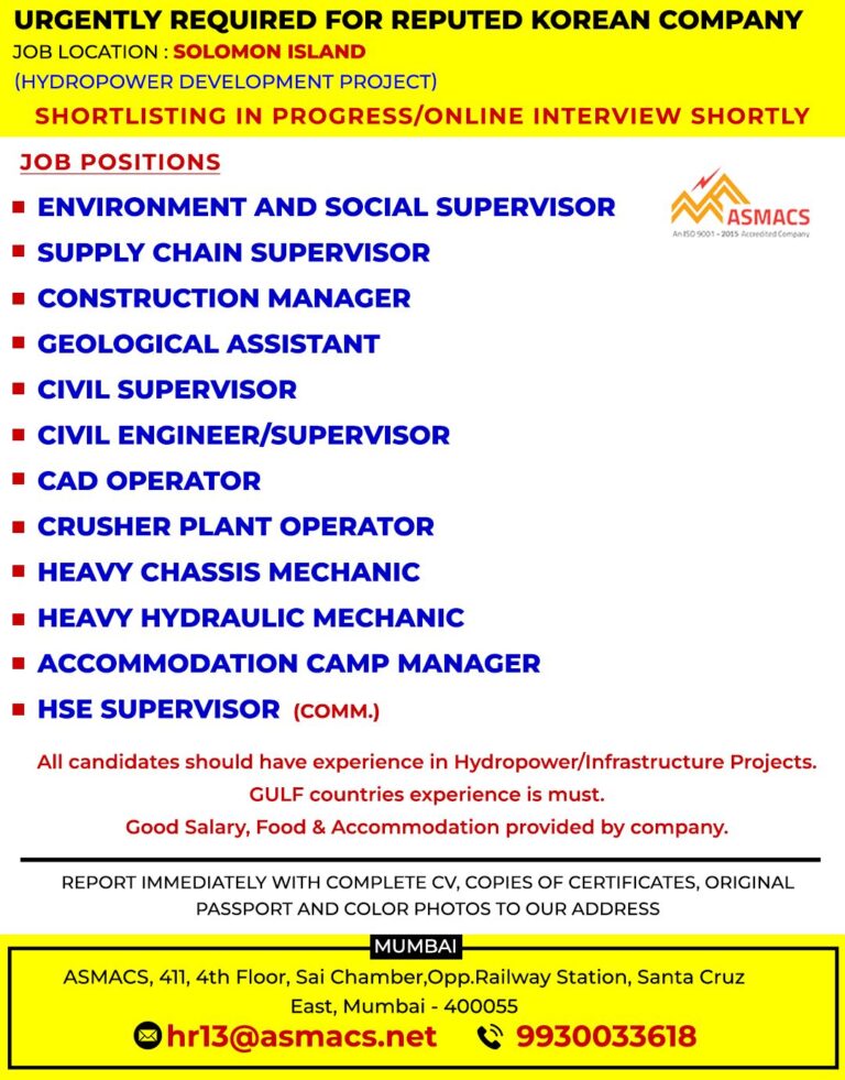 URGENTLY REQUIRED FOR REPUTED KOREAN COMPANYJOB LOCATION: SOLOMON ISLAND(HYDROPOWER DEVELOPMENT PROJECT)SHORTLISTING IN PROGRESS/ONLINE INTERVIEW SHORTLYJOB POSITIONSENVIRONMENT AND SOCIAL SUPERVISOR■SUPPLY CHAIN …