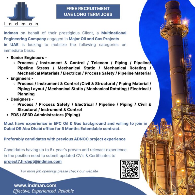 Indman on behalf of their prestigious Client, a Multinational Engineering Company engagedin Major Oil and Gas Projects in UAE is …
