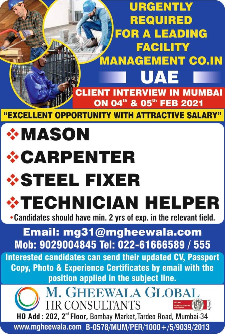 URGENTLY REQUIRED FOR A LEADINGFACILITY MANAGEMENT CO.IN UAECLIENT INTERVIEW IN MUMBAION 04th & 05th FEB 2021“EXCELLENT OPPORTUNITY WITH ATTRACTIVE SALARY”MASONCARPENTERSTEEL …
