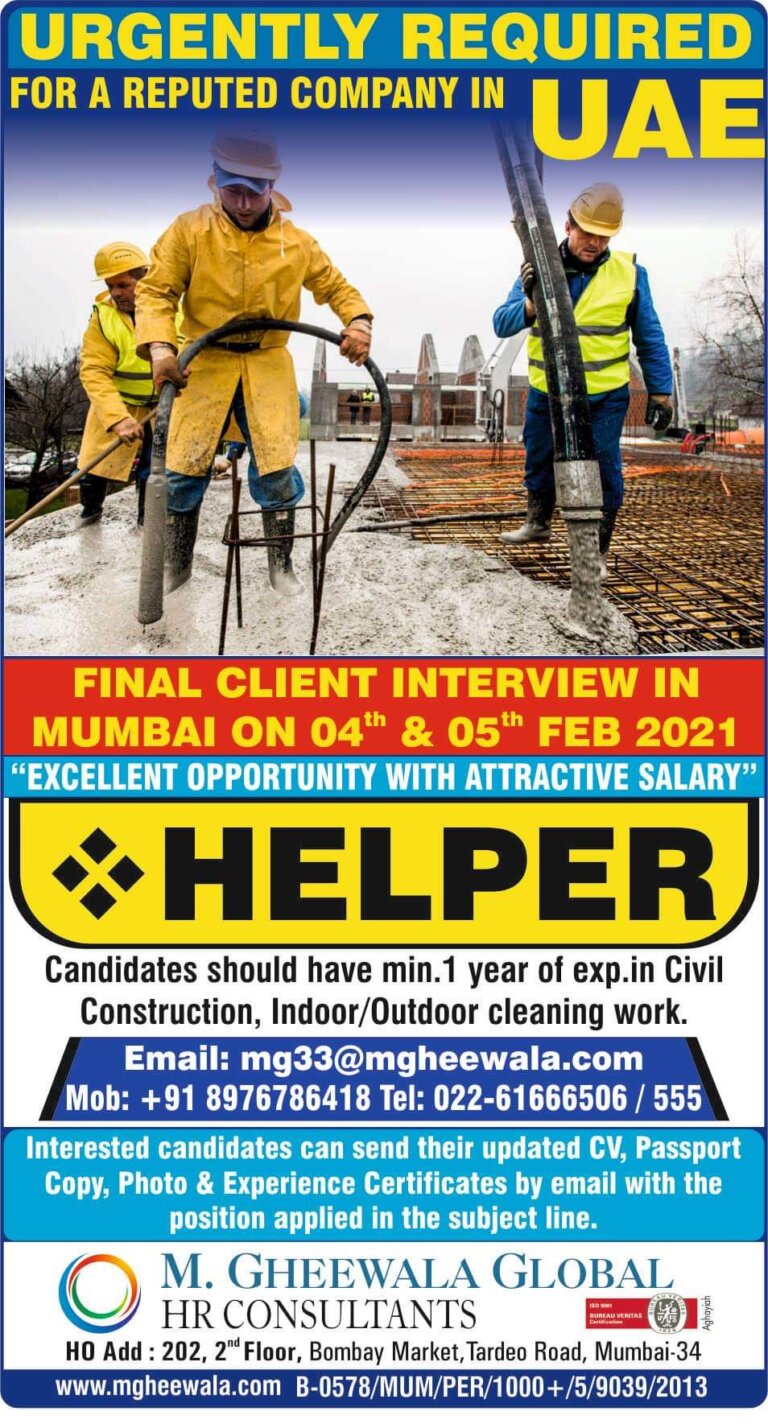 URGENTLY REQUIRESFOR A REPUTED COMPANY INUAEFINAL CLIENT INTERVIEW INMUMBAI ON 04th & 05th FEB 2021*HELPERCandidates should have min.l year of …