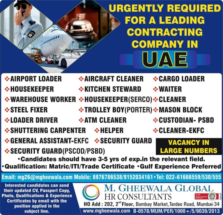 URGENTLY REQUIREDFOR A LEADINGCONTRACTINGCOMPANY IN-7 UAE4.AIRPORT LOADERHOUSEKEEPERWAREHOUSE WORKER•STEEL FIXERLOADER DRIVER•AIRCRAFT CLEANERKITCHEN STEWARDTROLLEY BOY(PORTER)• MASON BLOCK•ATM CLEANER•SHUTTERING CARPENTERHELPERGENERAL ASSISTANT-ETC •SECURITY GUARDSECURITY …