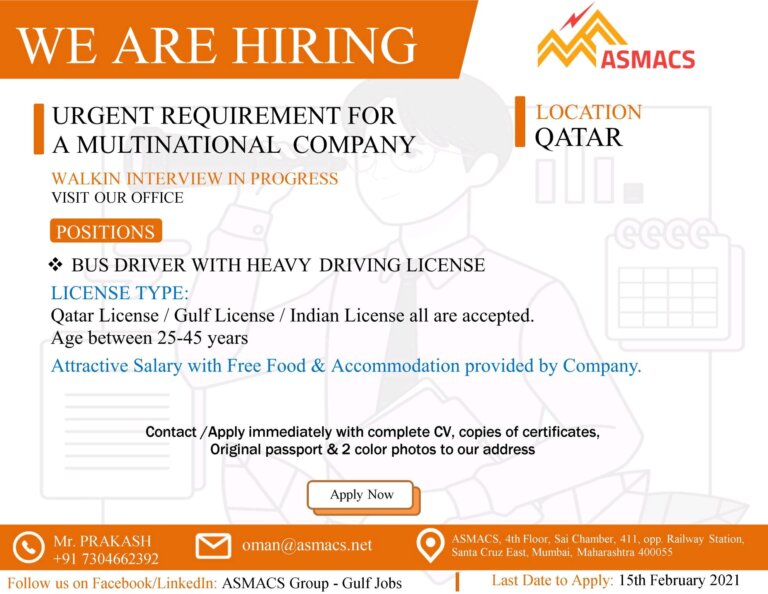 WE ARE HIRINGURGENT REQUIREMENT FORA MULTINATIONAL COMPANYWALKIN INTERVIEW IN PROGRESSVISIT OUR OFFICEPOSITIONSBUS DRIVER WITH HEAVY DRIVING LICENSELICENSE TYPE:ASMACSLOCATIONQATARQatar License / …