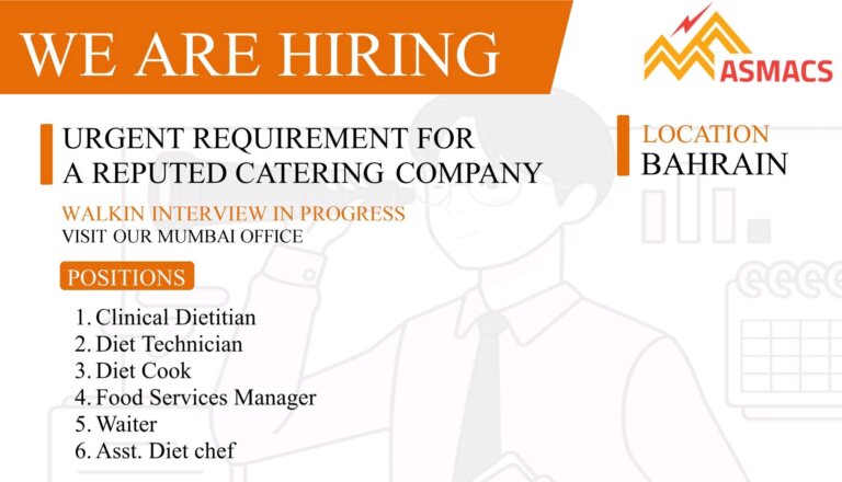 WE ARE HIRINGURGENT REQUIREMENT FORA REPUTED CATERING COMPANYWALKIN INTERVIEW IN PROGRESSVISIT OUR MUMBAI OFFICEPOSITIONSI. Clinical Dietitian2. Diet Technician3. Diet Cook4. …