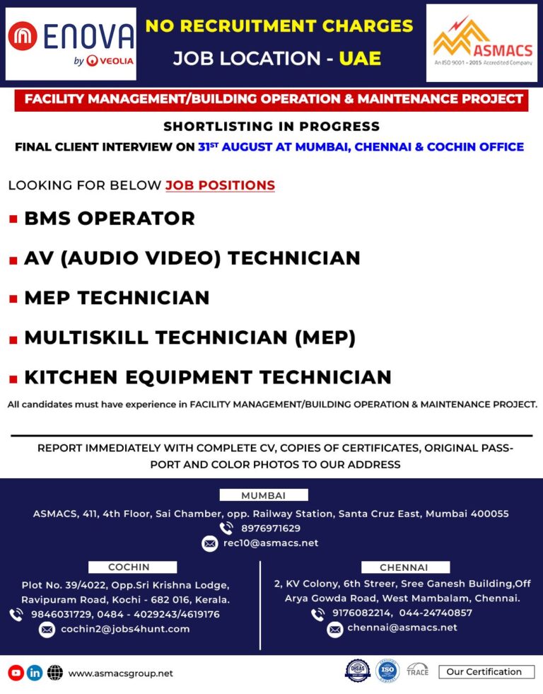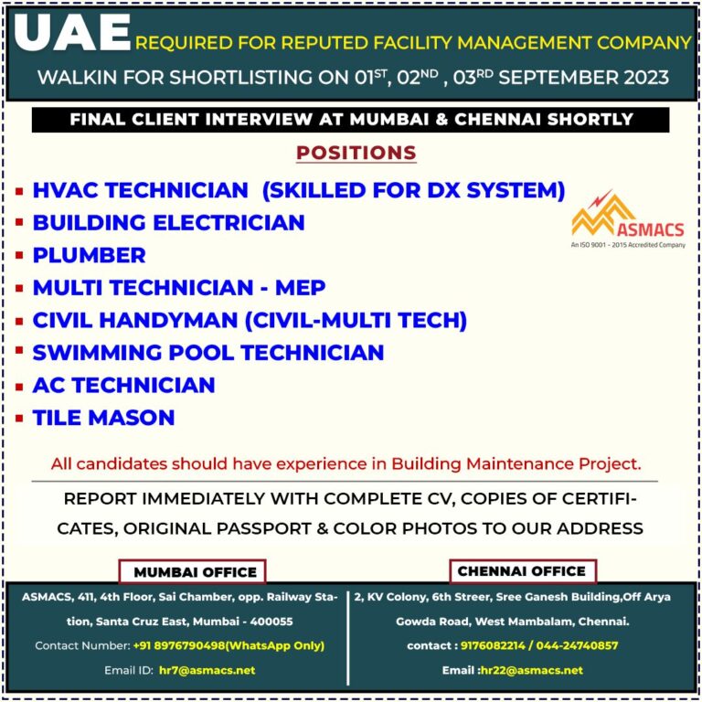 JOB LOCATION – UAEFACILITY MANAGEMENT/BUILDING OPERATION & MAINTENANCE PROJECTSHORTLISTING IN PROGRESSFINAL CLIENT INTERVIEW ON 31ST AUGUST AT MUMBAI, CHENNAI & …