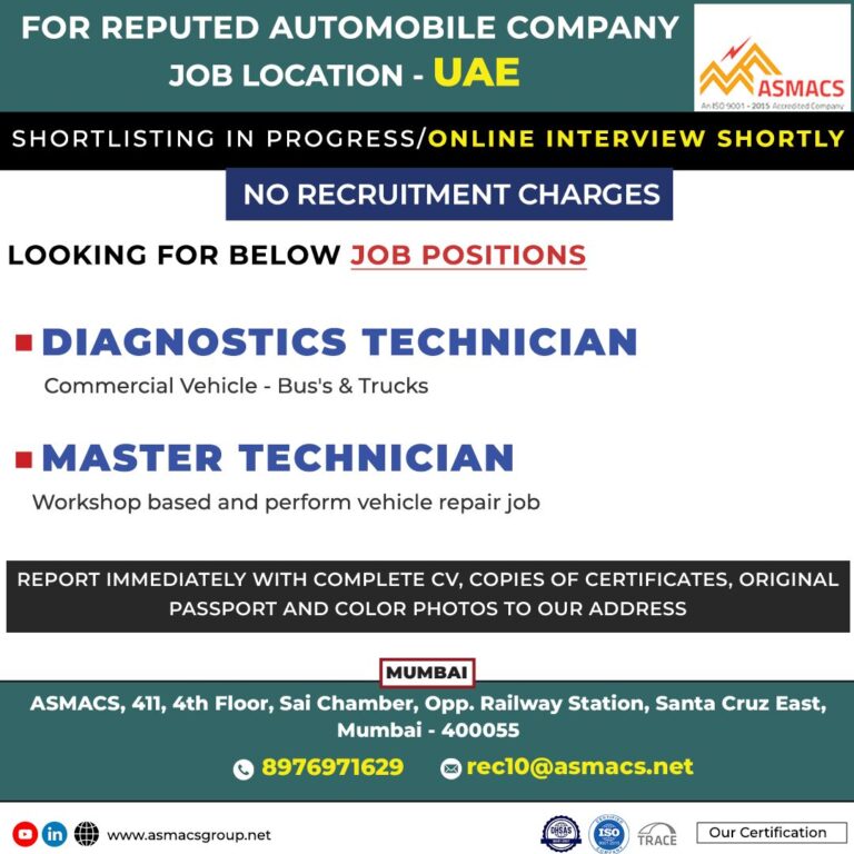 FOR REPUTED AUTOMOBILE COMPANYJOB LOCATION – UAESHORTLISTING IN PROGRESS/ONLINE INTERVIEW SHORTLYNO RECRUITMENT CHARGESLOOKING FOR BELOW JOB POSITIONS■ DIAGNOSTICS TECHNICIANCommercial Vehicle …
