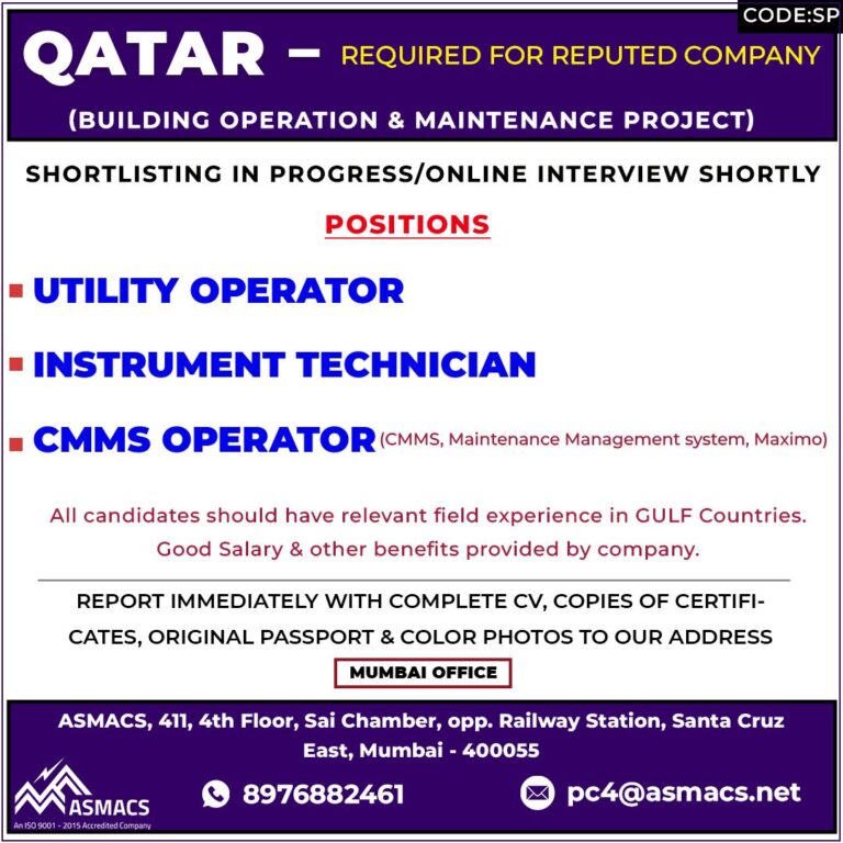 QATAR – REQUIRED FOR REPUTED COMPANY(BUILDING OPERATION & MAINTENANCE PROJECT)SHORTLISTING IN PROGRESS/ONLINE INTERVIEW SHORTLYPOSITIONS
