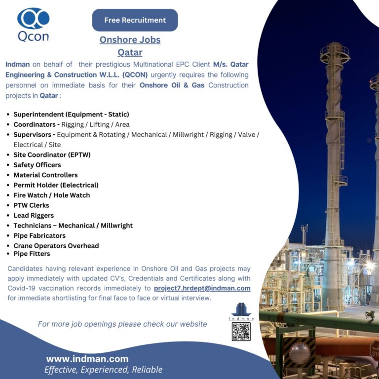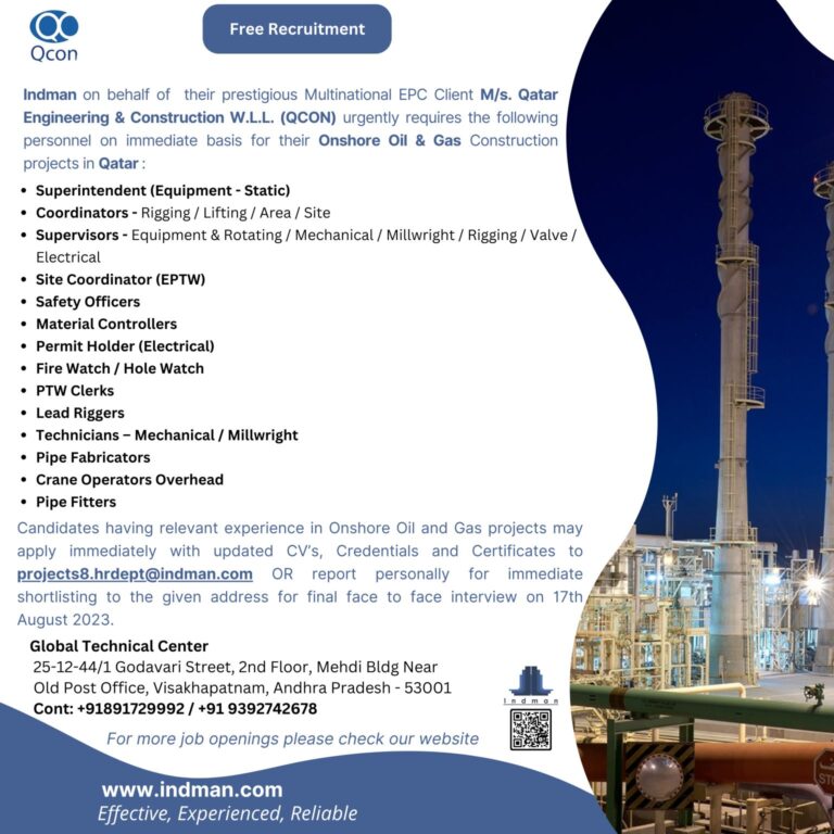 Indman on behalf of their prestigious Multinational EPC Client M/s. Qatar Engineering & Construction W.L.L. (QCON) urgently requires the following …