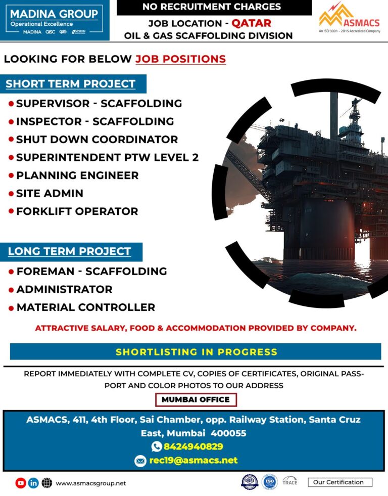 MADINA GROUPOperational ExcellenceMADINA QISC QIS SEVERNNO RECRUITMENT CHARGESJOB LOCATION – QATAROIL & GAS SCAFFOLDING DIVISIONLOOKING FOR BELOW JOB POSITIONSSHORT TERM …