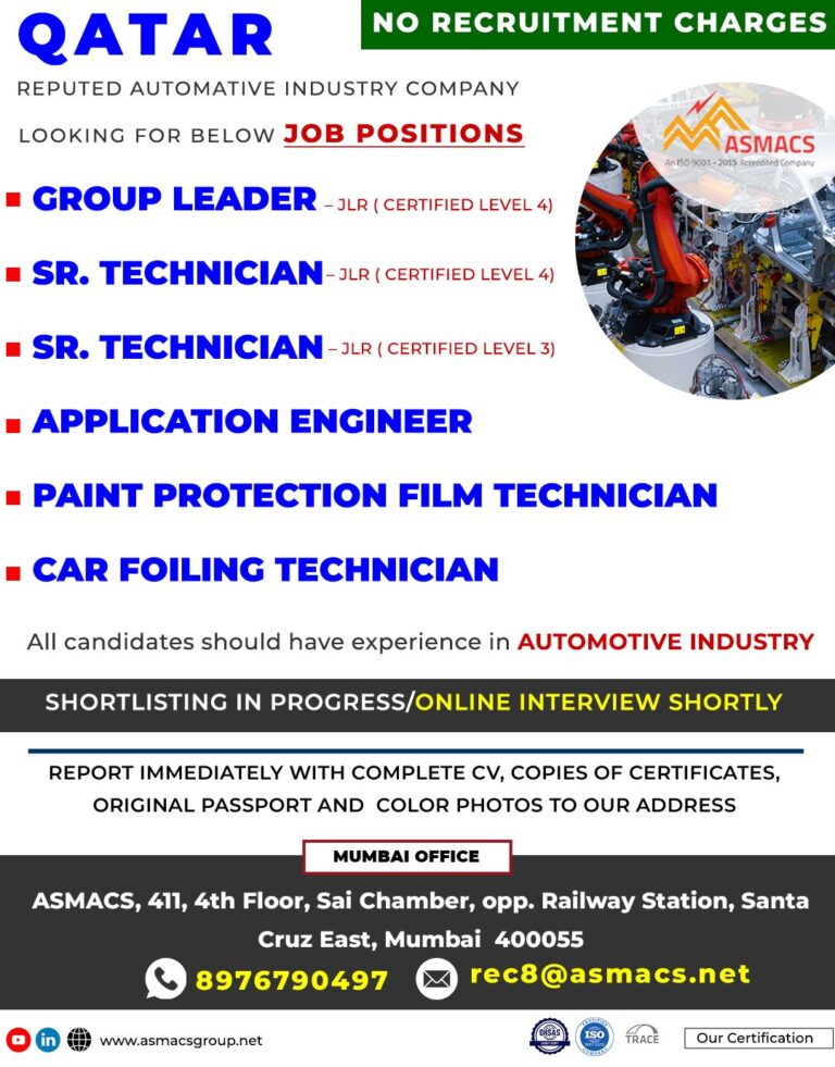 QATARREPUTED AUTOMATIVE INDUSTRY COMPANYNO RECRUITMENT CHARGESLOOKING FOR BELOW JOB POSITIONS■ GROUP LEADER-JLR (CERTIFIED LEVEL 4)■ SR. TECHNICIAN-JLR (CERTIFIED LEVEL 4)■ …