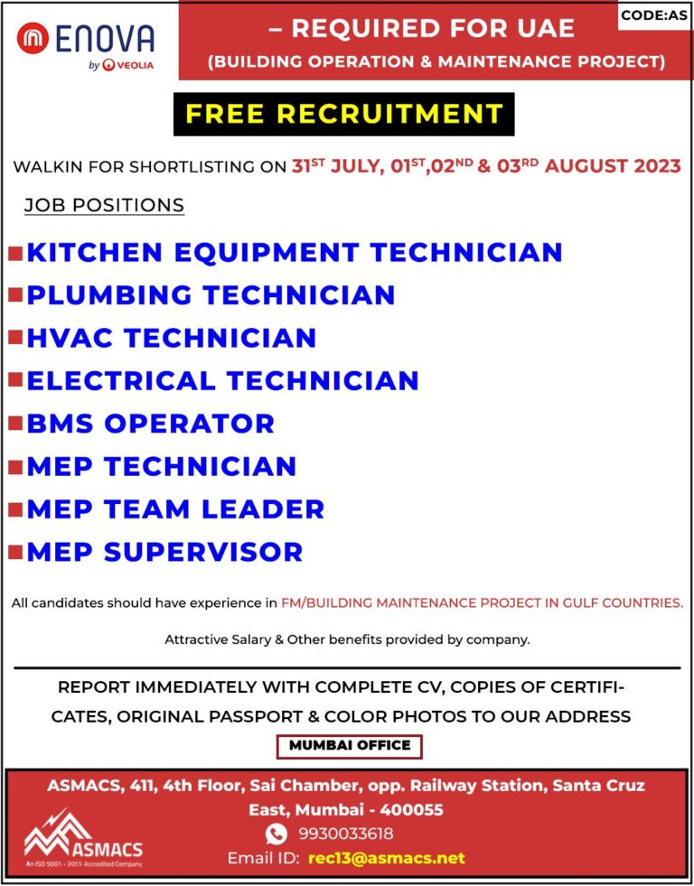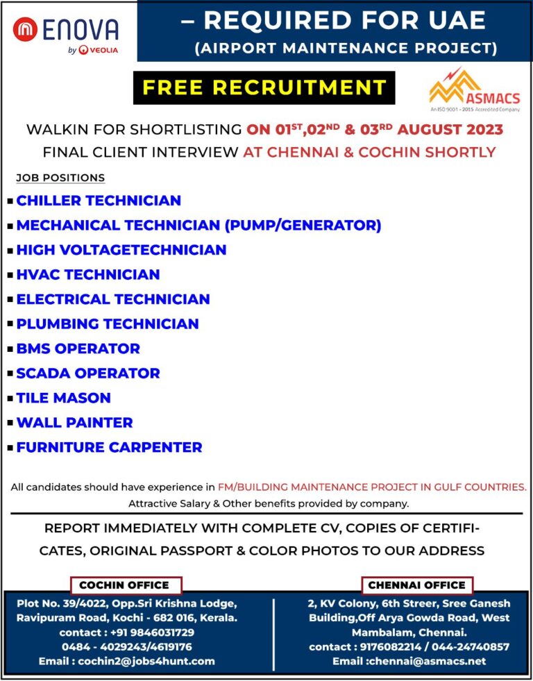 WALKIN FOR SHORTLISTING ON 01ST,02ND & 03RD AUGUST 2023FINAL CLIENT INTERVIEW AT CHENNAI & COCHIN SHORTLYREQUIRED FOR UAE(AIRPORT MAINTENANCE PROJECT)■ …