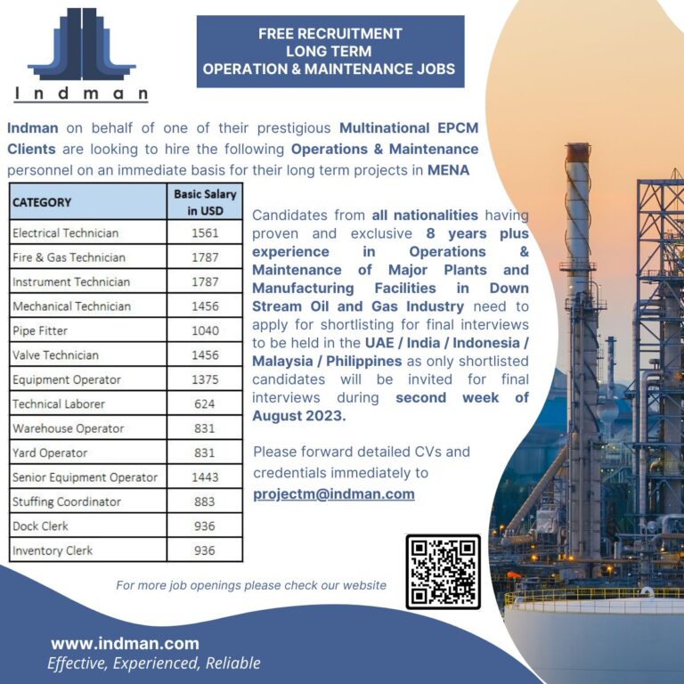 Long Term Operation and Maintenance Jobs Indman on behalf of one of their prestigious Multinational EPCM Clients are looking to …