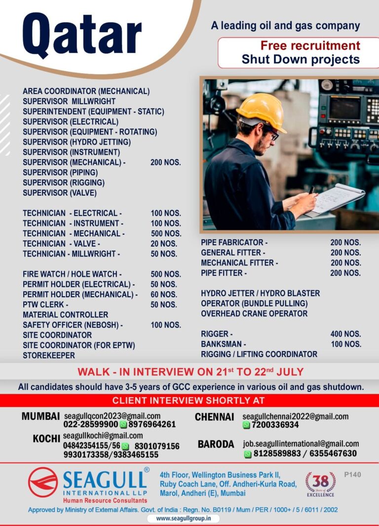 QATAR-REQUIRED FOR ELECTROMECHANICAL CONTRACTING COMPANY(OIL & GAS PROJECT)NO RECRUITMENTCHARGESSHORTLISTING IN PROGRESS AT MUMBAI, CHENNAI & MADURAI OFFICEFINAL CLIENT INTERVIEW AT …