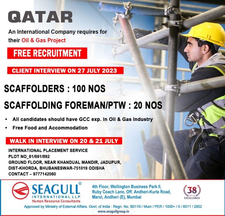 QATARAn International Company requires fortheir Oil & Gas ProjectFREE RECRUITMENTCLIENT INTERVIEW ON 27 JULY 2023SCAFFOLDERS : 100 NOSSCAFFOLDING FOREMAN/PTW : …