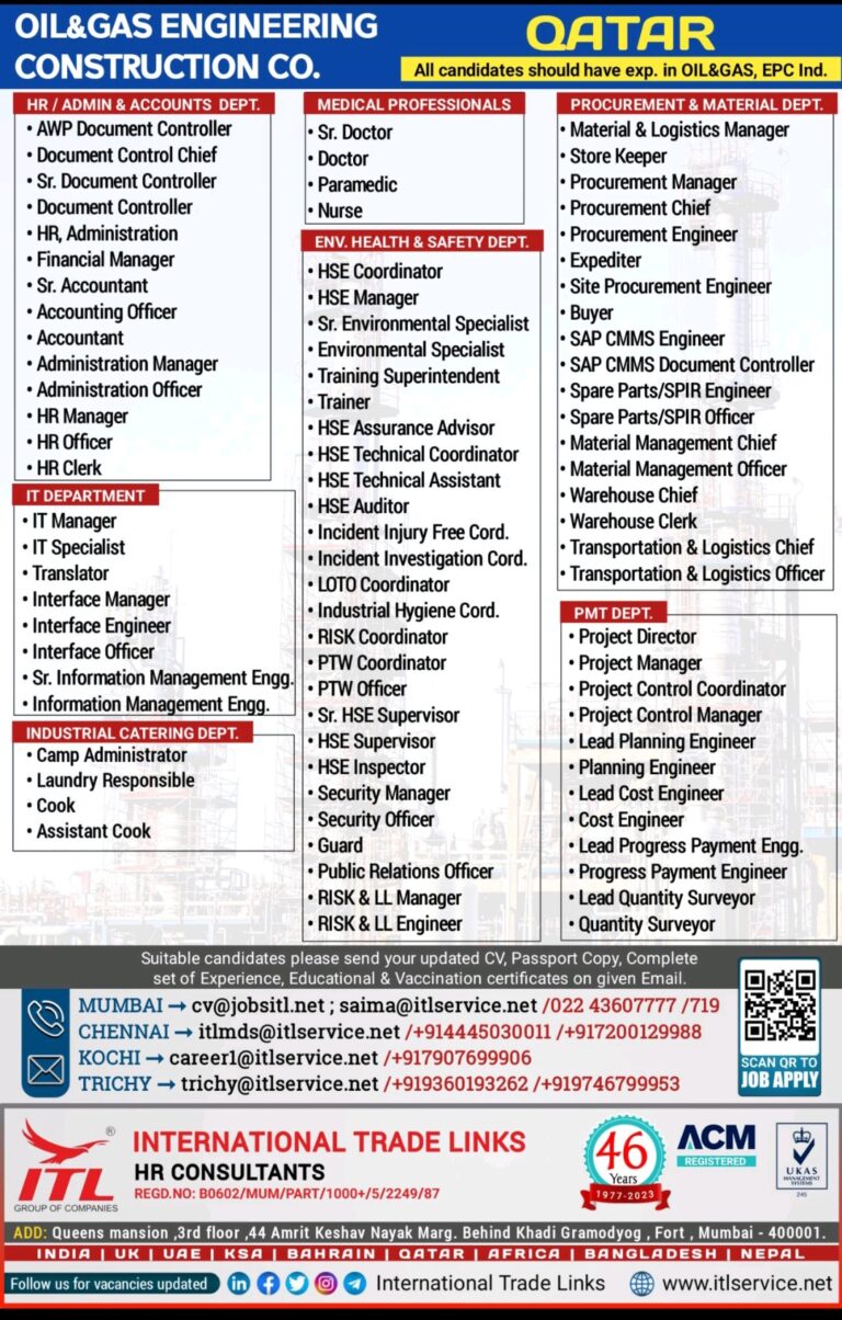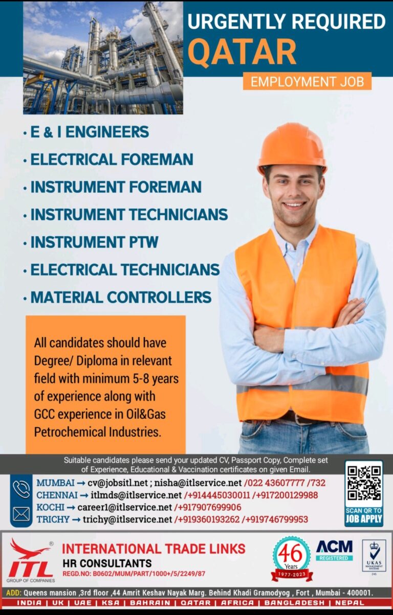 E & I ENGINEERS URGENTLY REQUIRED QATAREMPLOYMENT JOBELECTRICAL FOREMANINSTRUMENT FOREMANINSTRUMENT TECHNICIANSINSTRUMENT PTWELECTRICAL TECHNICIANS