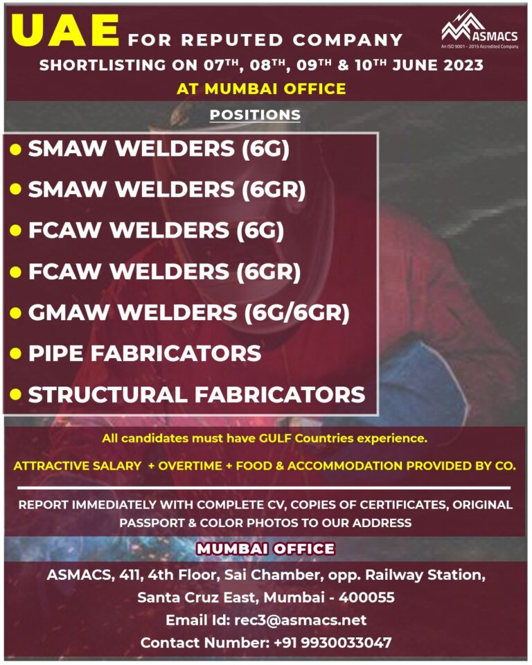 UAE FOR REPUTED COMPANYSHORTLISTING ON 07TH, 08TH, 09TH & 10TH JUNE 2023AT MUMBAI OFFICEPOSITIONSSMAW WELDERS (6G)● SMAW WELDERS (6GR)FCAW WELDERS …